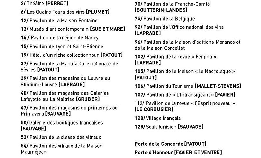 • Pierre Patout : Diplômé de l’École des beaux-arts de Paris en 1903, Pierre Patout (1879-1965) est considéré comme l’un des protagonistes de l’Art déco. À l’Exposition de 1925, Patout présente cinq projets : la porte de la Concorde, le pavillon de la Manufacture Nationale de Sèvres, les réalisations de Patout incarnent la perméabilité des différents courants architecturaux de l’entre-deux-guerres.