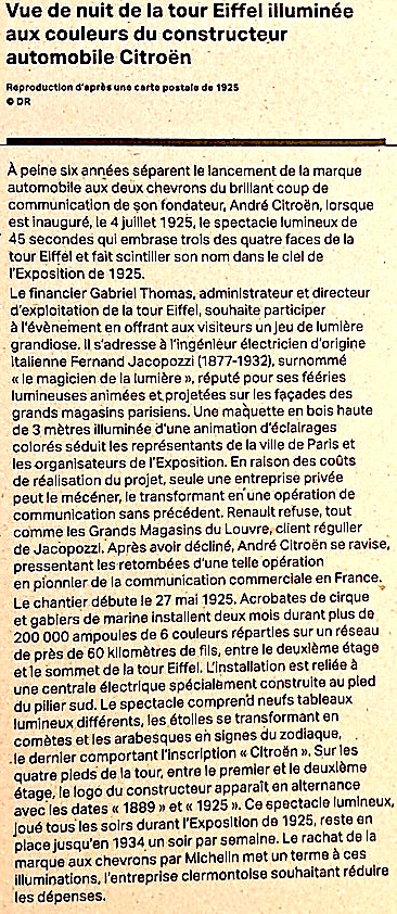 La Tour Eiffel s’invite dans la manifestation. Inaugurée le 15 mai 1889, jour de l’ouverture de l’Exposition Universelle, elle va faire un spectacle lumineux de 45 secondes en scintillant dans le ciel de l’exposition de 1925. Toute une histoire :