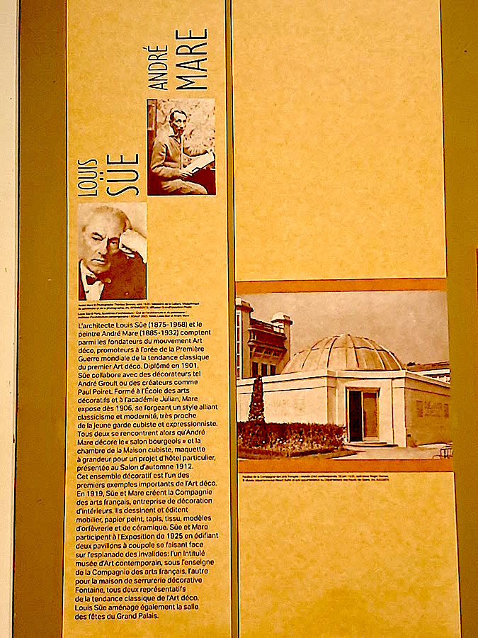 • Louis Süe et André Mare : L’architecte Louis Süe (1875-1968) et le peintre André Mare (1885-1932) comptent parmi les fondateurs du mouvement Art déco, promoteurs à l’orée de la Première Guerre mondiale de la tendance classique du premier Art déco. Süe et Mare participent à l’Exposition de 1925 en édifiant deux pavillons à coupole se faisant face sur l’esplanade des Invalides : l’un intitulé musée d’Art contemporain, sous l’enseigne de la Compagnie des arts français, l’autre pour la maison de la serrurerie d’art Fontaine :