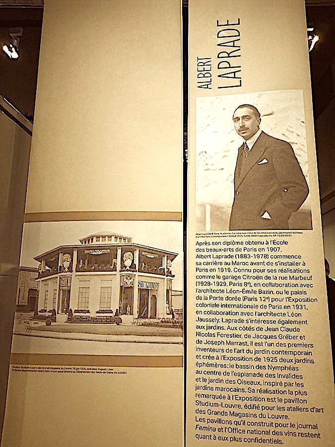 • Albert Laprade : après son diplôme obtenu à l’École des beaux- arts de Paris en 1907, Albert Laprade (1883- 1978) commence sa carrière au Maroc avant de s’installer à Paris en 1919. Sa réalisation la plus remarquée à l’Exposition est le Studium-Louvre, le pavillon édifié pour les ateliers d’art des Grands Magasins du Louvre :