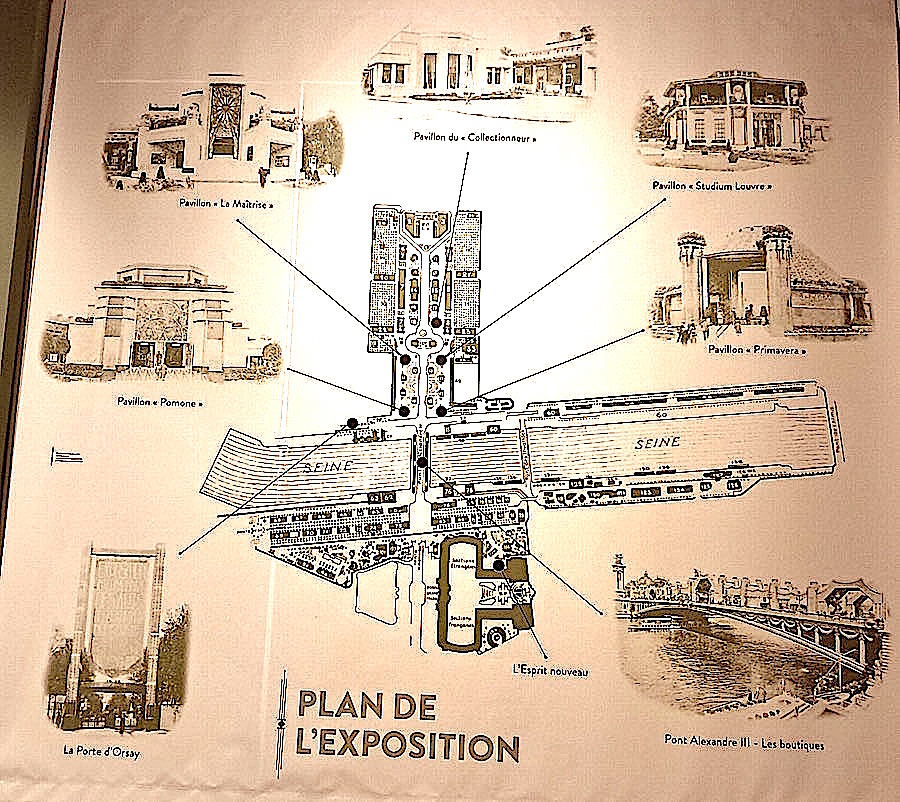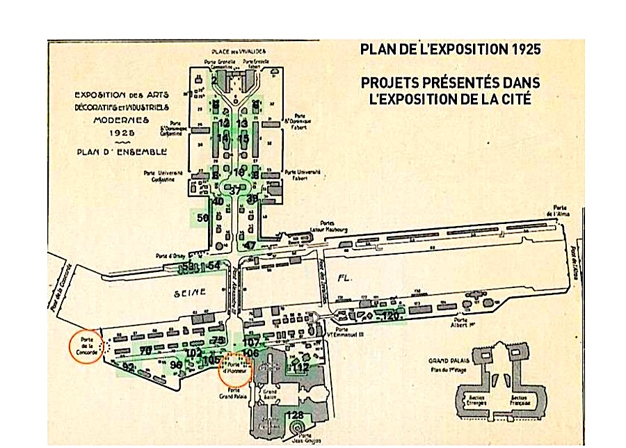 C’est un site central, en plein cœur économique de Paris, facile d’accès, qui est finalement choisi en octobre 1922. Une véritable ville dans la ville de 23 hectares – terrain exigu au regard des précédentes expositions universelles – s’élève en une année, ordonnée sur deux axes principaux : du rond-point des Champs-Élysées à l’esplanade des Invalides en passant par le pont Alexandre-III et, sur les deux rives de la Seine, de la place de la Concorde au pont de l’Alma, Grand Palais compris. Trois portes principales lui donnent accès : la porte d’Honneur, édifiée entre le Grand et le Petit Palais, la porte de la Concorde, à l’entrée des jardins du cours la Reine et, rive gauche, la porte d’Orsay.