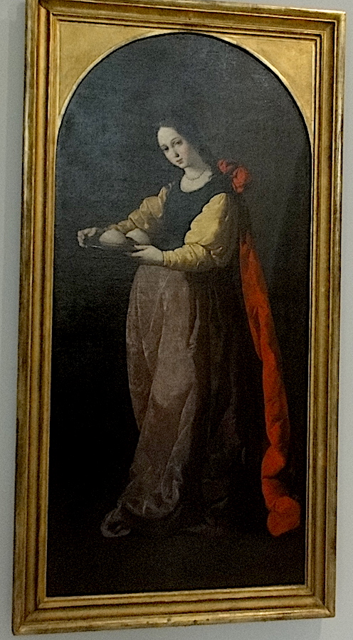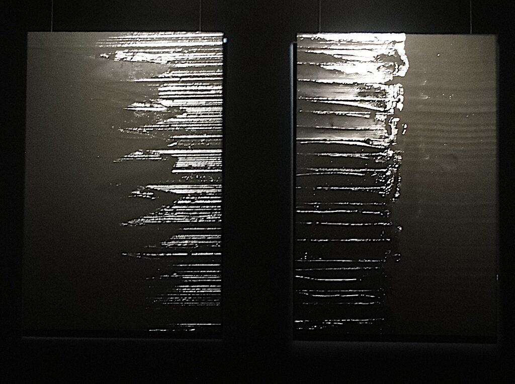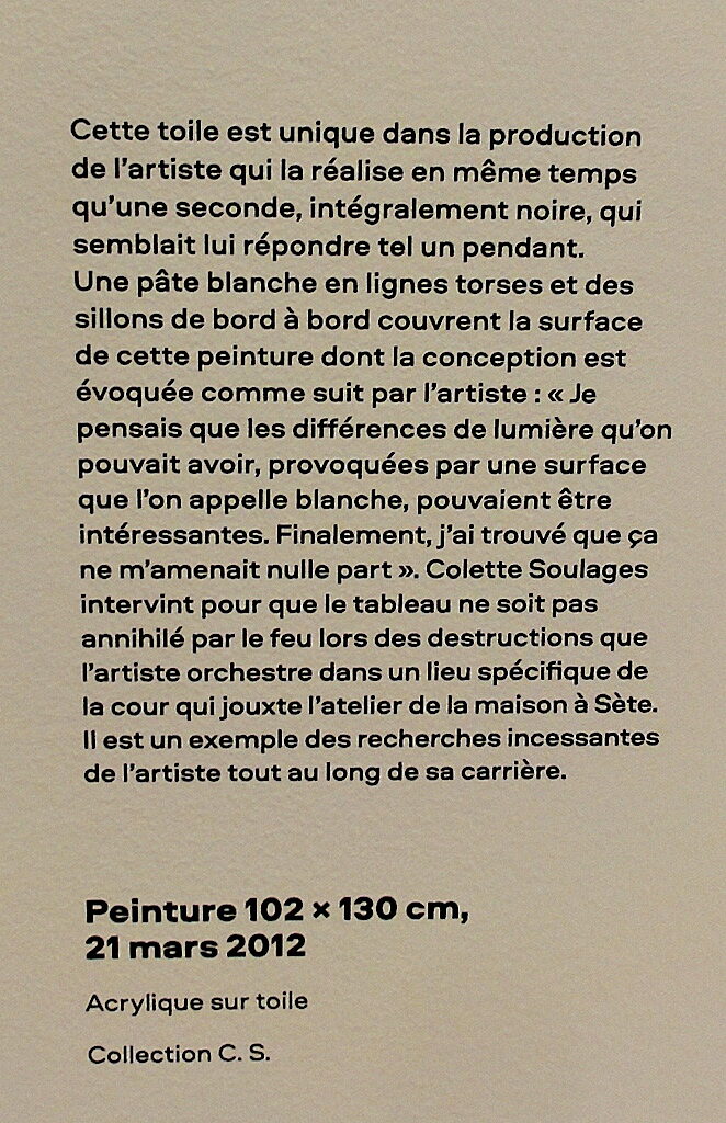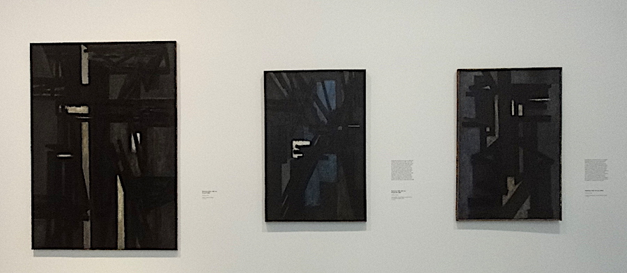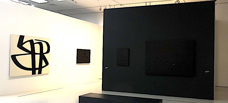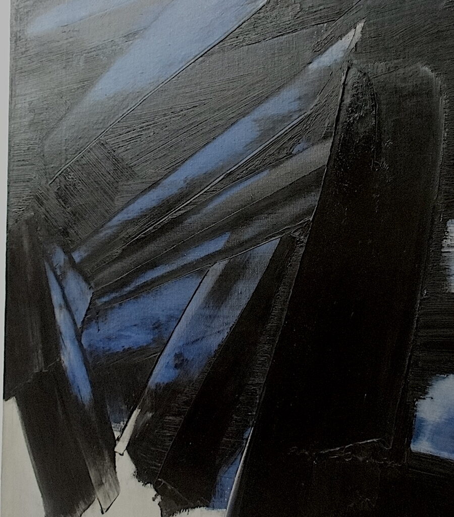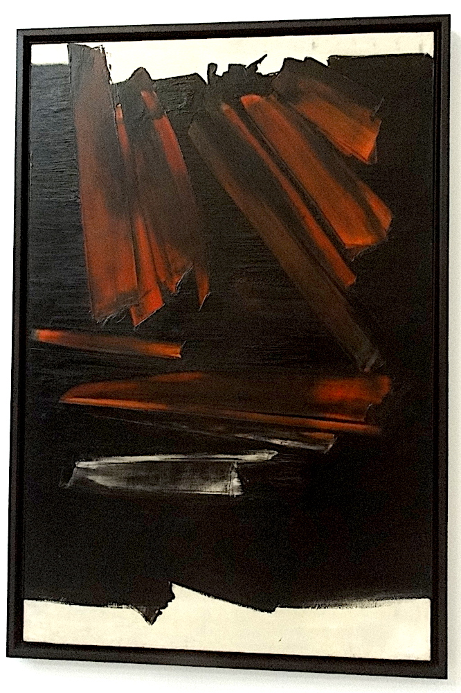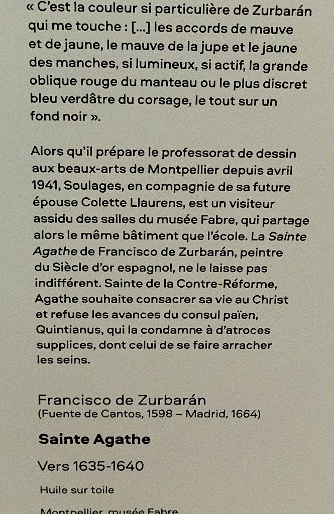 La magie de cette exposition réside en ce que l’on a l’impression de voir les tableaux de Soulages pour la première fois ! cf : « L’Art d’être Curieux » du 17/08/2020 🙂 La mise en espace, à la fois épurée et lumineuse de Maud Martinot (architecte et scénographe d’expositions), incite à la contemplation et à l’émerveillement, voire à l’interrogation devant le « Saint Agathe » de Zubaran, par exemple, qui nous paraît si éloigné de Soulages… Et pourtant… Chaque rencontre est soigneusement orchestrée et nous amène à regarder autrement l’oeuvre de Soulages.