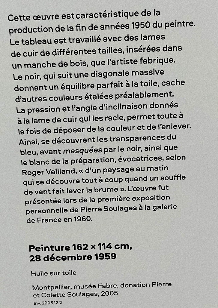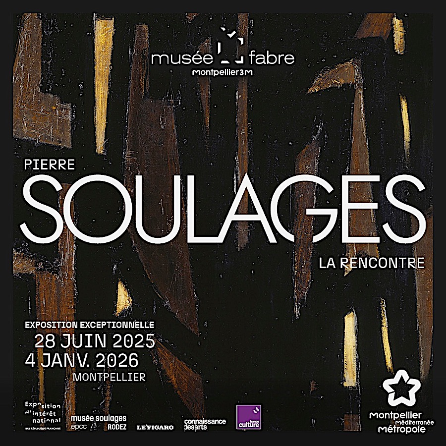 Jusqu’au 4 Janvier 2026, le musée Fabre de Montpellier présente une superbe exposition sur Pierre Soulages. Cette exposition, intitulée « LA RENCONTRE », nous propose de partager la rencontre de l’artiste avec l’Histoire de l’Art, en mettant en regard certaines oeuvres de Pierre Soulages et des tableaux célèbres. Le musée Fabre a lié depuis de nombreuses années une relation privilégiée avec Pierre Soulages qui disait que « Plus que tout autre ce musée a compté pour moi !« En 2005, Pierre et Colette Soulages ont fait don au musée de 20 toiles, mis en dépot dix autres et le musée a fait l’achat de deux « Outrenoirs » de l’artiste en 1975 et 1999. Pour son bicentenaire le musée Fabre a donc tout naturellement choisi d’honorer Pierre Soulages.