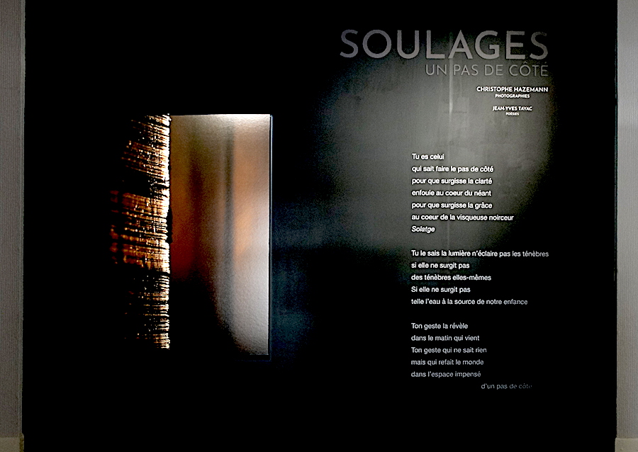 Si l’exposition « La rencontre » au musée Fabre de Montpellier vous a donné envie de (re)voir le musée Soulages de Rodez et/ou l’abbaye de Conques, vous prendrez la route… … Et vous devrez absolument vous arrêter à Millau, précisement au MUMIG ( Musée de Millau et des Grands Causse) pour admirer le remarquable travail de création de CHRISTOPHE HAZEMANN (co-directeur du musée Soulages de Rodez) : « UN PAS DE CÔTÉ» . Cette exposition présente 25 œuvres photographiques, majoritairement réalisées à partir des œuvres de Pierre Soulages. La sensibilité et la finesse de perception de Christophe Hazemann émeuvent beaucoup… « Voir au delà des apparences, tenter de se décentrer pour adopter le point de vue de l’objet, du reflet, du défaut apporte de la profondeur à notre perception (…) Tentons, nous aussi ce pas de côté». (Extrait du livret de visite)