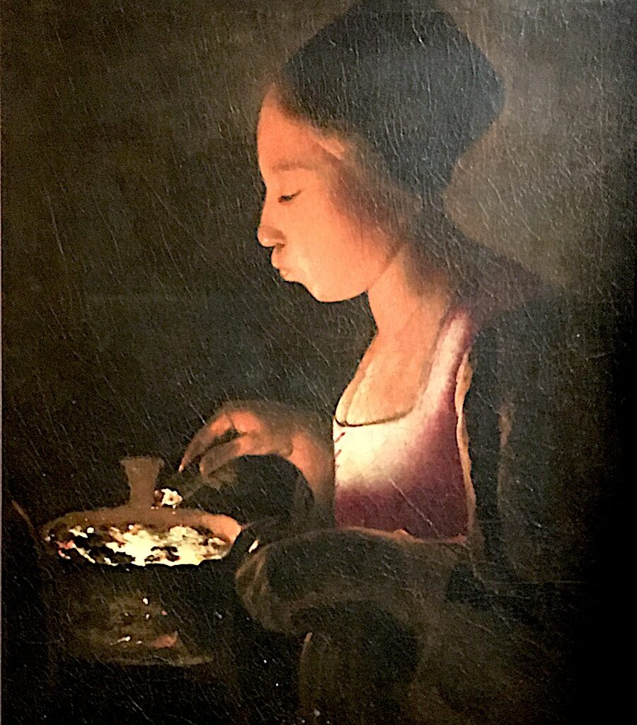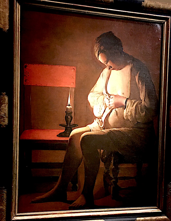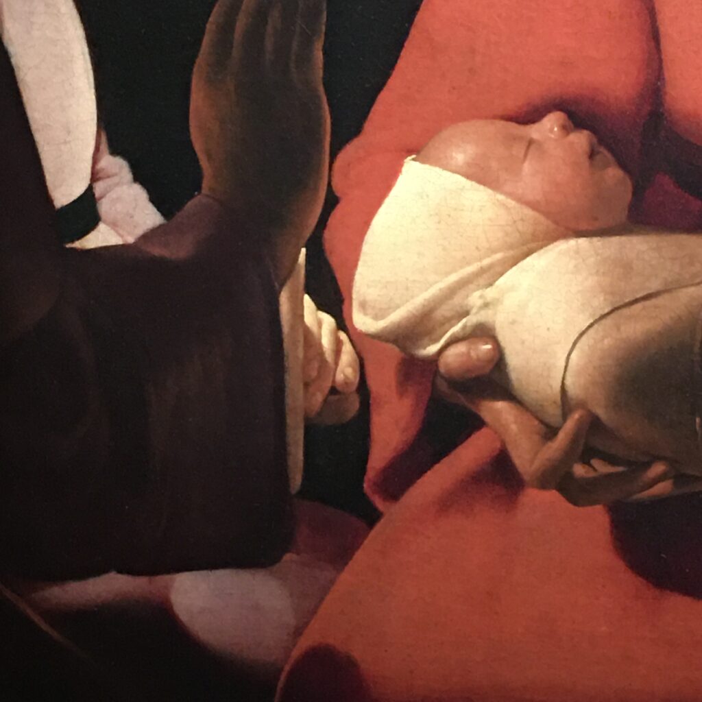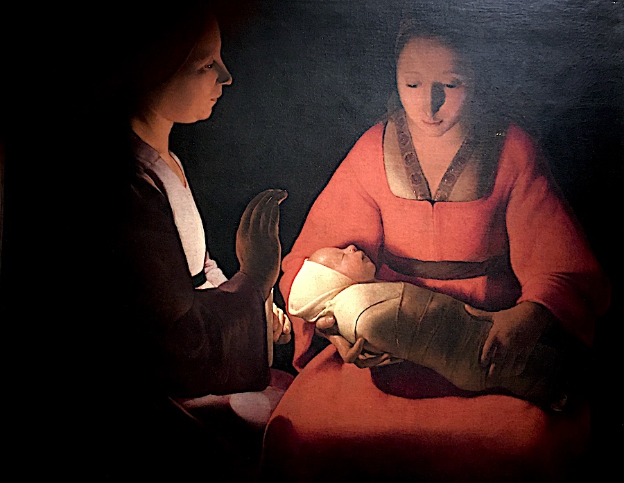 Ce tableau illustre bien comment Georges de la Tour transforme une scène domestique par la seule force de la lumière : il semblerait que la lumière émane du nourrisson… Peut-on y lire une allusion à la Vierge et à l’enfant Jésus ?