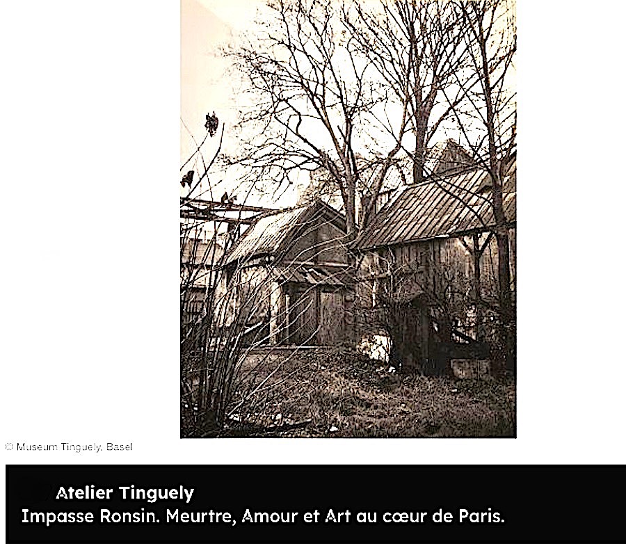 C’est dans l’impasse Ronsin à Paris, dans le quartier de Montparnasse, que des artistes de tous âges et origines travaillent. C’est là qu’au milieu des années 1950, Jean Tinguely fait la connaissance de Niki de Saint Phalle avec qui il se met en couple à partir de 1960 et qu’il partage son atelier.