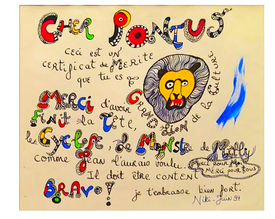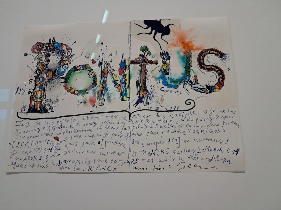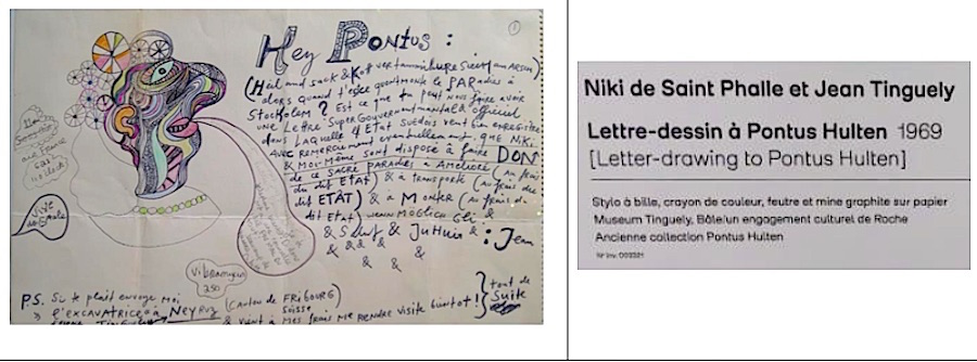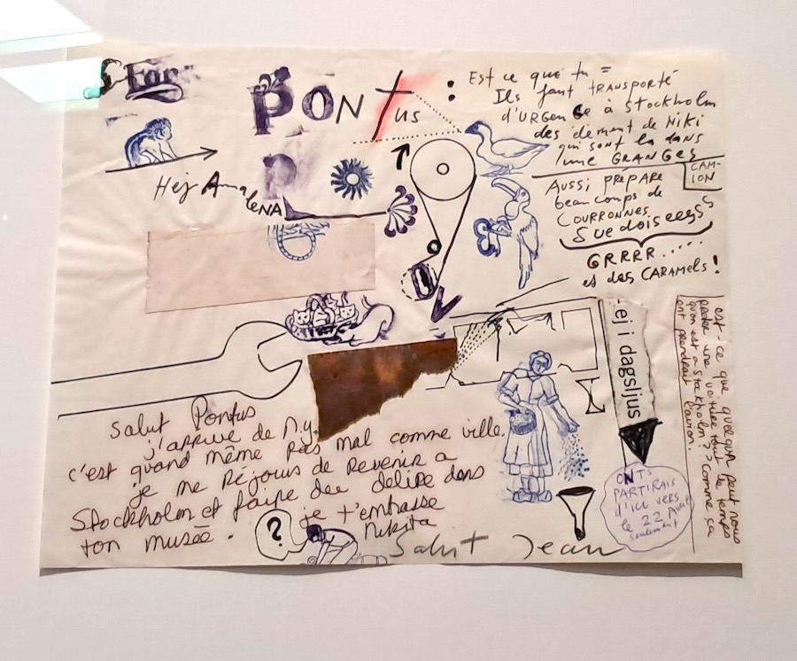 Cette correspondance révèle le haut degré d’intimité et de confiance qui a existé entre Niki de Saint Phalle, Jean Tinguely et Pontus Hulten. Dans une même lettre, on trouve des propos sur une œuvre, une exposition, des requêtes pressantes quand les artistes ont besoin d’aide… Avec toujours beaucoup d’humour et de simplicité. L’écriture part dans tous les sens, celle de Jean Tinguely s’agrégeant à celle de Niki de Saint Phalle ou l’inverse, le tout agrémenté de dessins, croquis, collages.