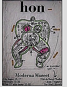 - « Hon – en katedral » ( « Elle – en cathédrale ») 1966 – une œuvre intéractive, une gigantesque sculpture de femme qui occupe une salle entière du Musée de Stockholm. Niki de Saint Phalle fait une sculpture de femme monumentale de 28 mètres de longueur, couchée sur le dos.